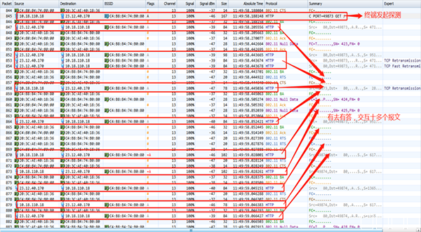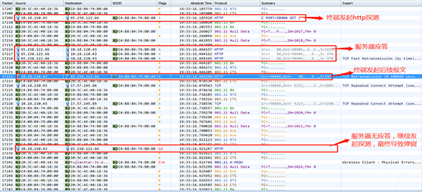 異常交互流程:在服務(wù)器丟包時(shí),抓取到終端異常交互流程,如下圖所示,終端發(fā)起http探測,服務(wù)器僅回復(fù)了第一個聚合報(bào)文,之后終端發(fā)起后續(xù)報(bào)文,服務(wù)器無應(yīng)答。在終端多次嘗試服務(wù)器無回應(yīng)時(shí),最終認(rèn)為是Wi-Fi網(wǎng)絡(luò)出現(xiàn)問題,觸發(fā)彈窗提示。