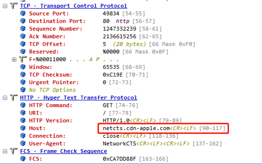 既然排除了設(shè)備與無線網(wǎng)絡(luò)本身的問題,接下來只能放大招了,通過空口抓包軟件,抓取彈窗提示時(shí)iPhone手機(jī)的交互報(bào)文進(jìn)行分析,有了重大發(fā)現(xiàn)?。ㄕ堊孕心X補(bǔ)柯南背景音樂)。此時(shí)手機(jī)正在對蘋果服務(wù)器netcts.cdn-apple.com進(jìn)行http報(bào)文探測,報(bào)文如下圖所示: